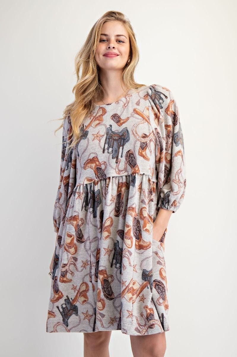 Easel Western Print Brushed Hacci 3/4 Sleeve Babydoll Dress