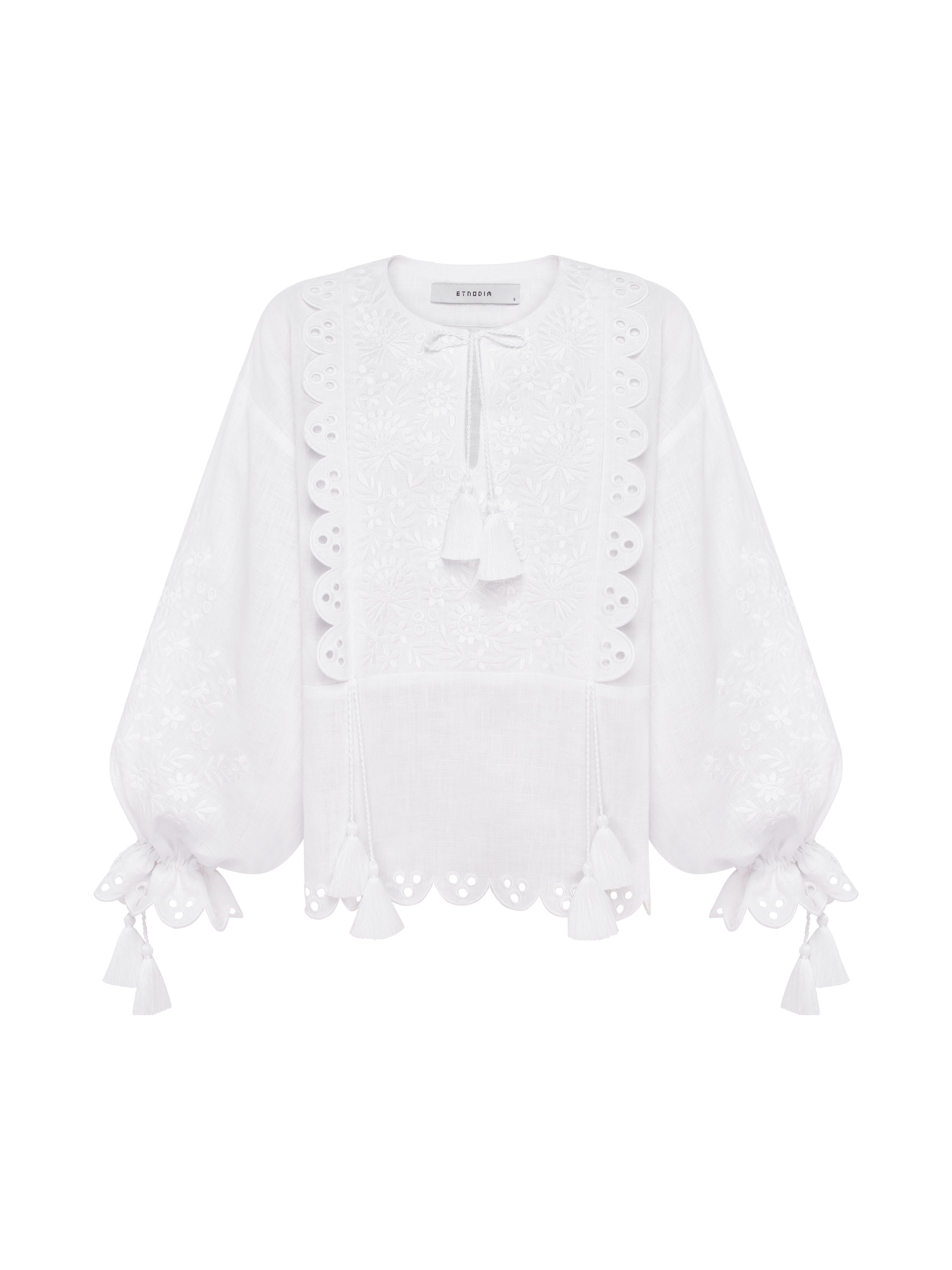Craftsmanship: All-over floral embroidery + openwork lace + tassel ties