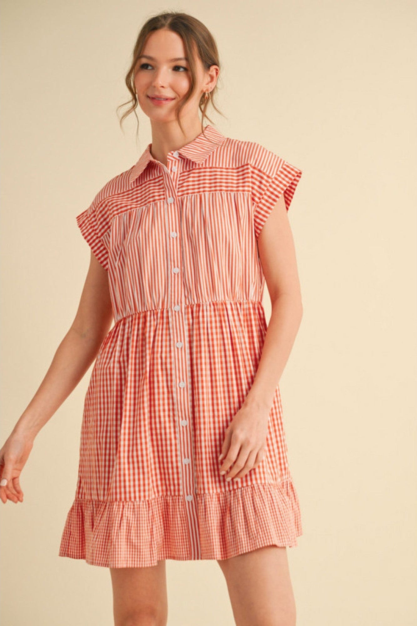 Jodifl Check and Stripes Button Down Dress with Cap Sleeves and Ruffled Hemline