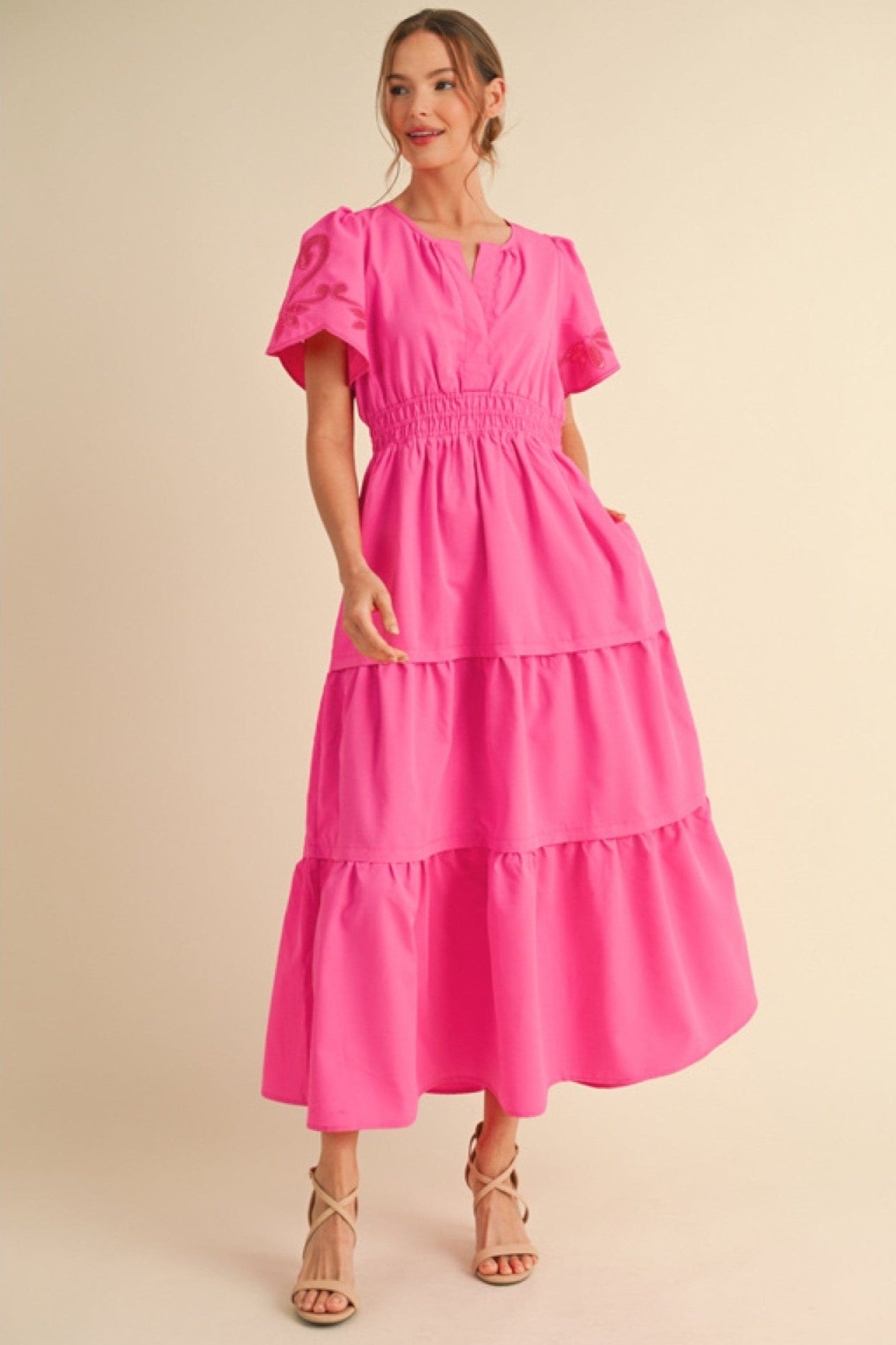 Jodifl Puff Short Sleeve Smocked Waistline Slit Neckline Tiered Maxi Dress