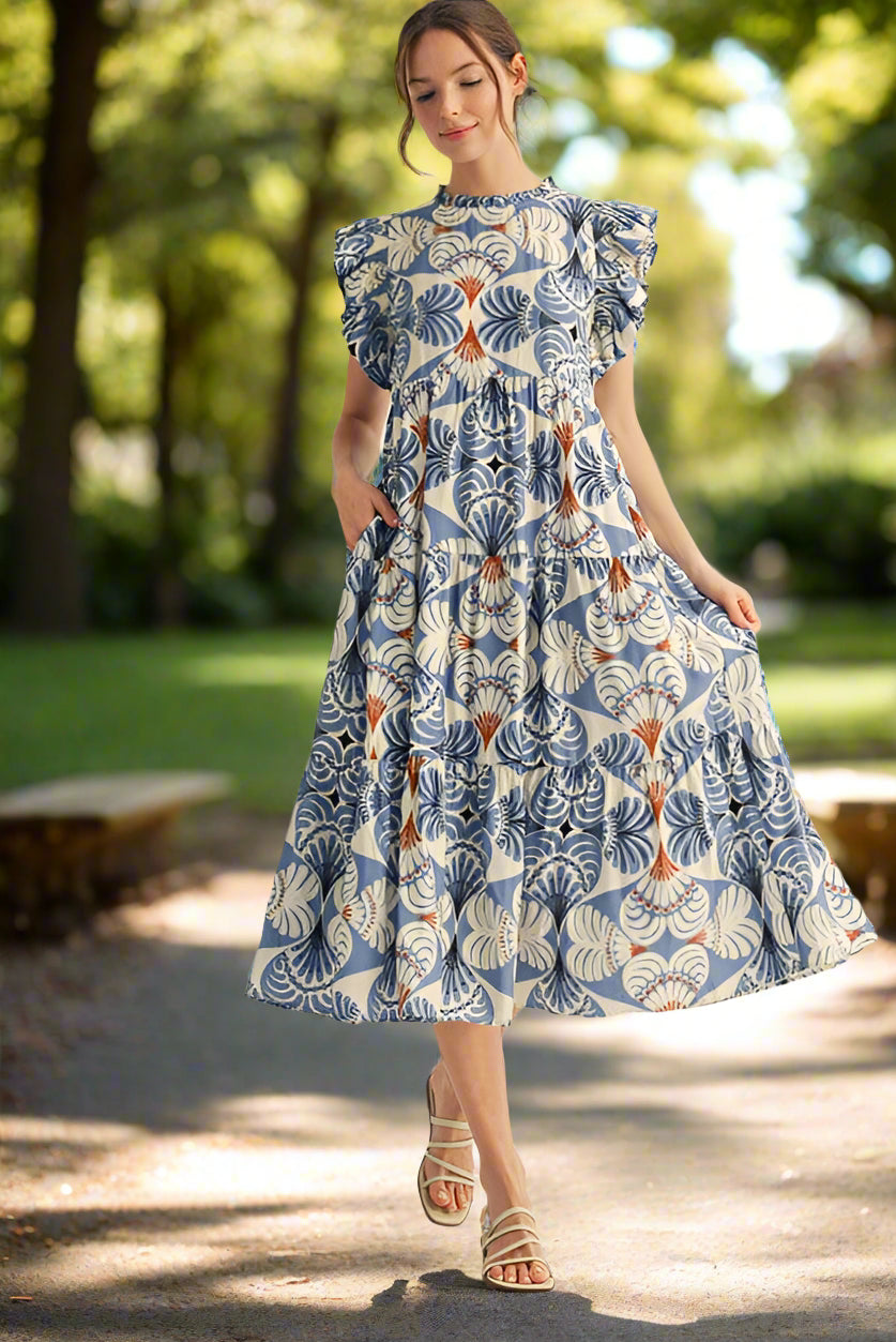Jodifl Short Ruffle Cap Sleeves Leaf Style Heart Print Tiered Midi Dress - Sold Out