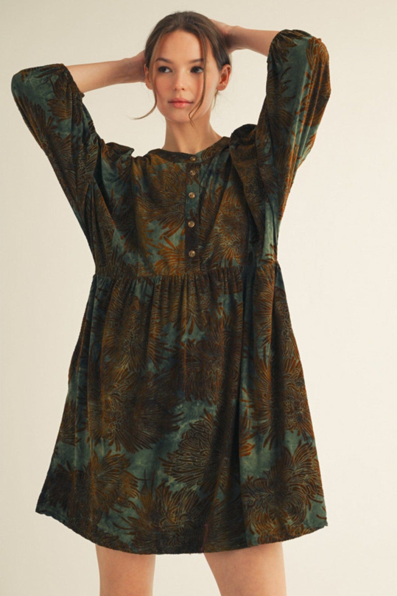 Jodifl Tie Dye Base Velvet Floral Design Jacquard Dress with Side Pockets