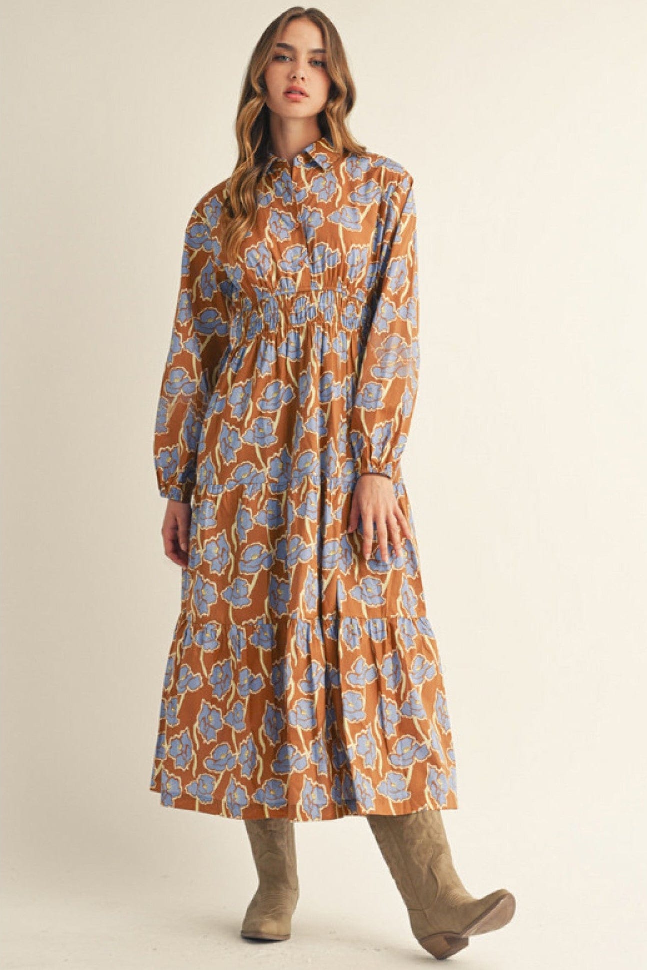 Jodifl Tiered Front Button Down Collared Neckline Tiered Midi Dress