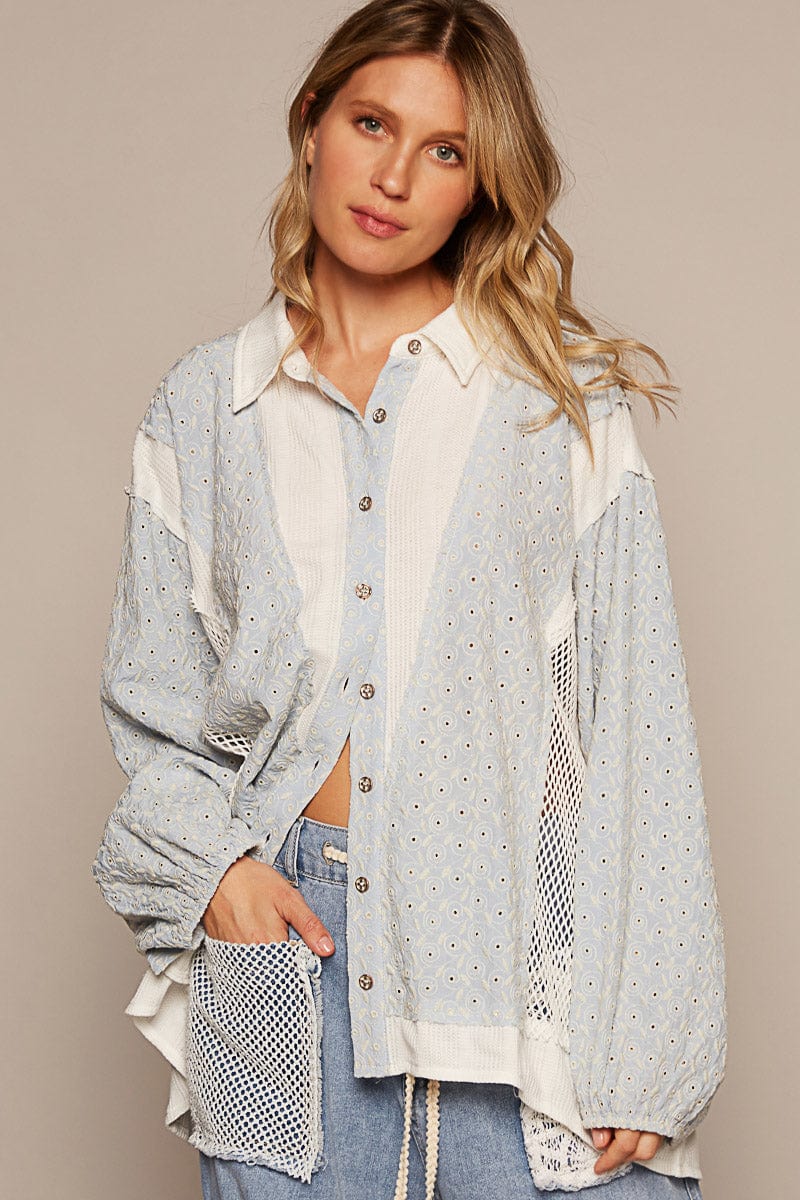 POL Long Sleeve Oversized Fit Shirt with See-Through Crochet Panel