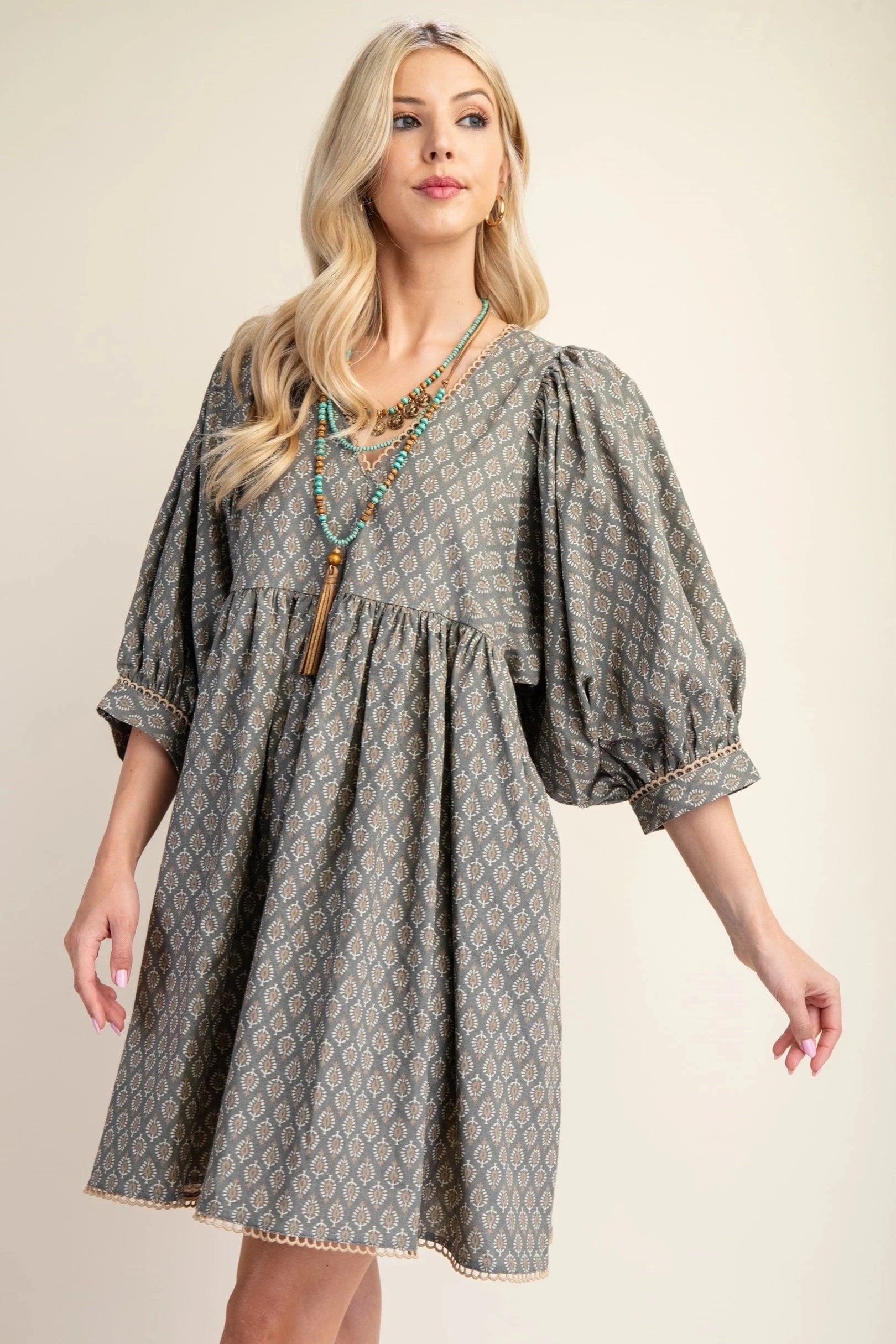 Printed Puff Sleeve Babydoll Dress with Scalloped Lace Trim