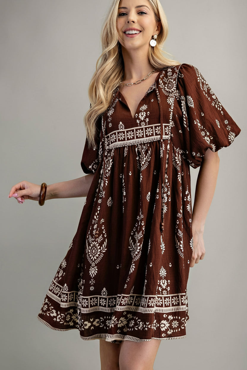Printed Puff Sleeve Babydoll Mini Dress with Neck Ties