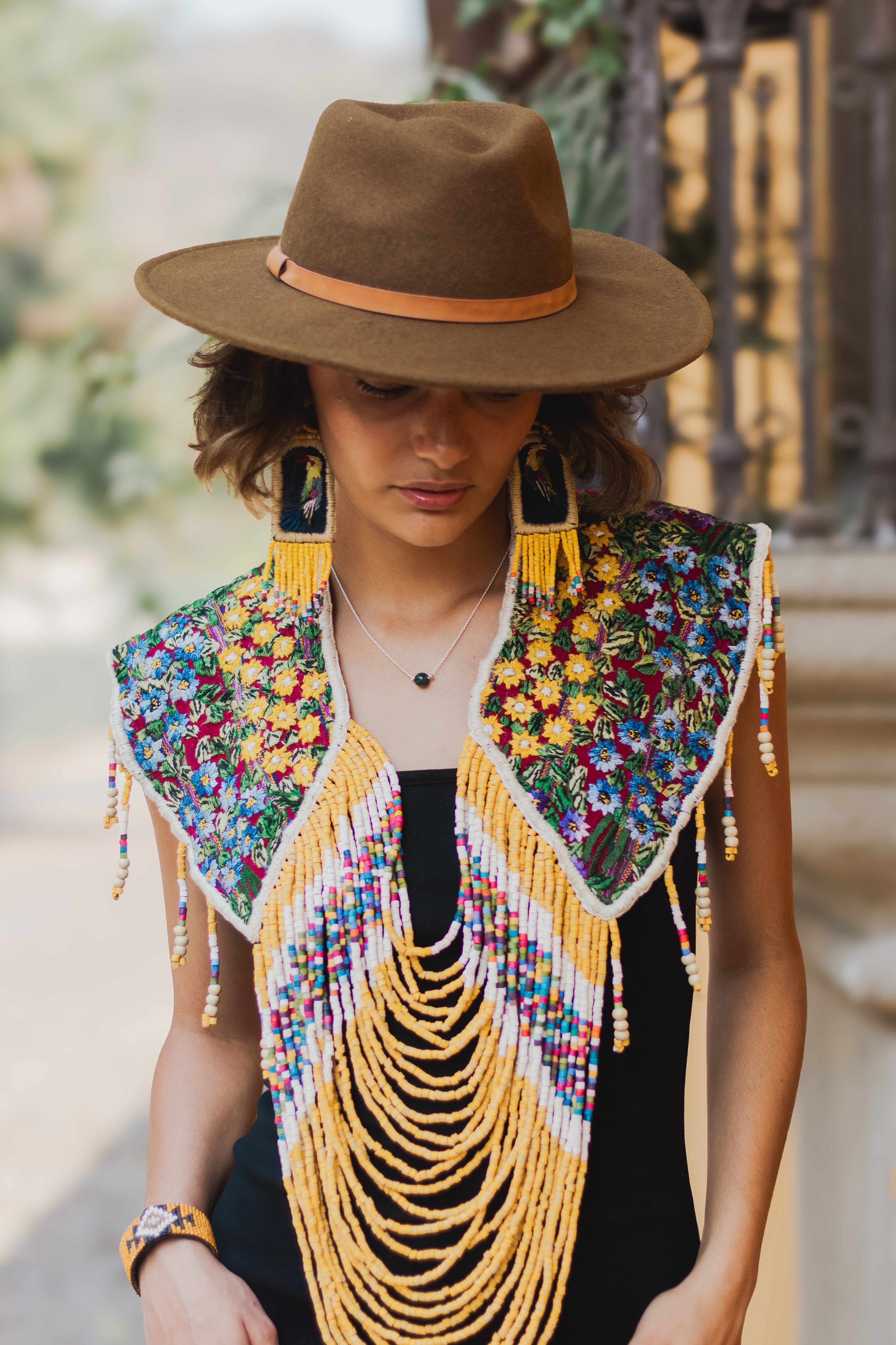 Our shoulder ornaments cleverly blend traditional and modern design for a statement piece. Each piece is handcrafted from upcycled Mayan textiles, steeped in the rich history of the indigenous community, and its intricate patterns reflect the vibrant culture of the region. Each fragment is meticulously carved and transformed into textile earrings, bracelets, and now, this stunning piece of wearable art.