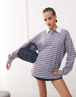 This loose-fitting, blue-and-brown striped rugby-inspired top offers a relaxed yet vintage-inspired look. Featuring classic striped colorblocking, a loose fit, and dropped shoulders, it effortlessly creates a casual vibe. The lapel collar and open front placket, a signature rugby jersey design, offer both comfort and style.
