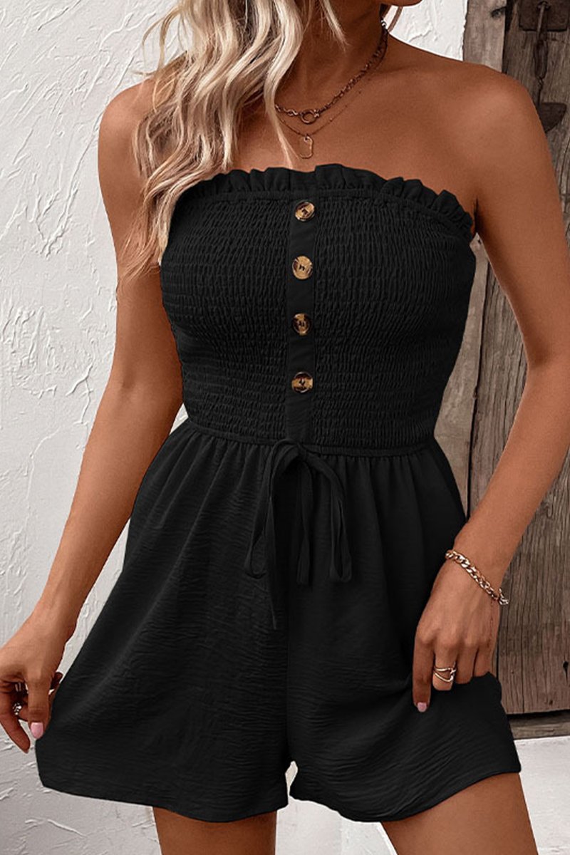 Summer Trendy Solid Color Shirred Partial Button Drawstring Sleeveless Playsuit