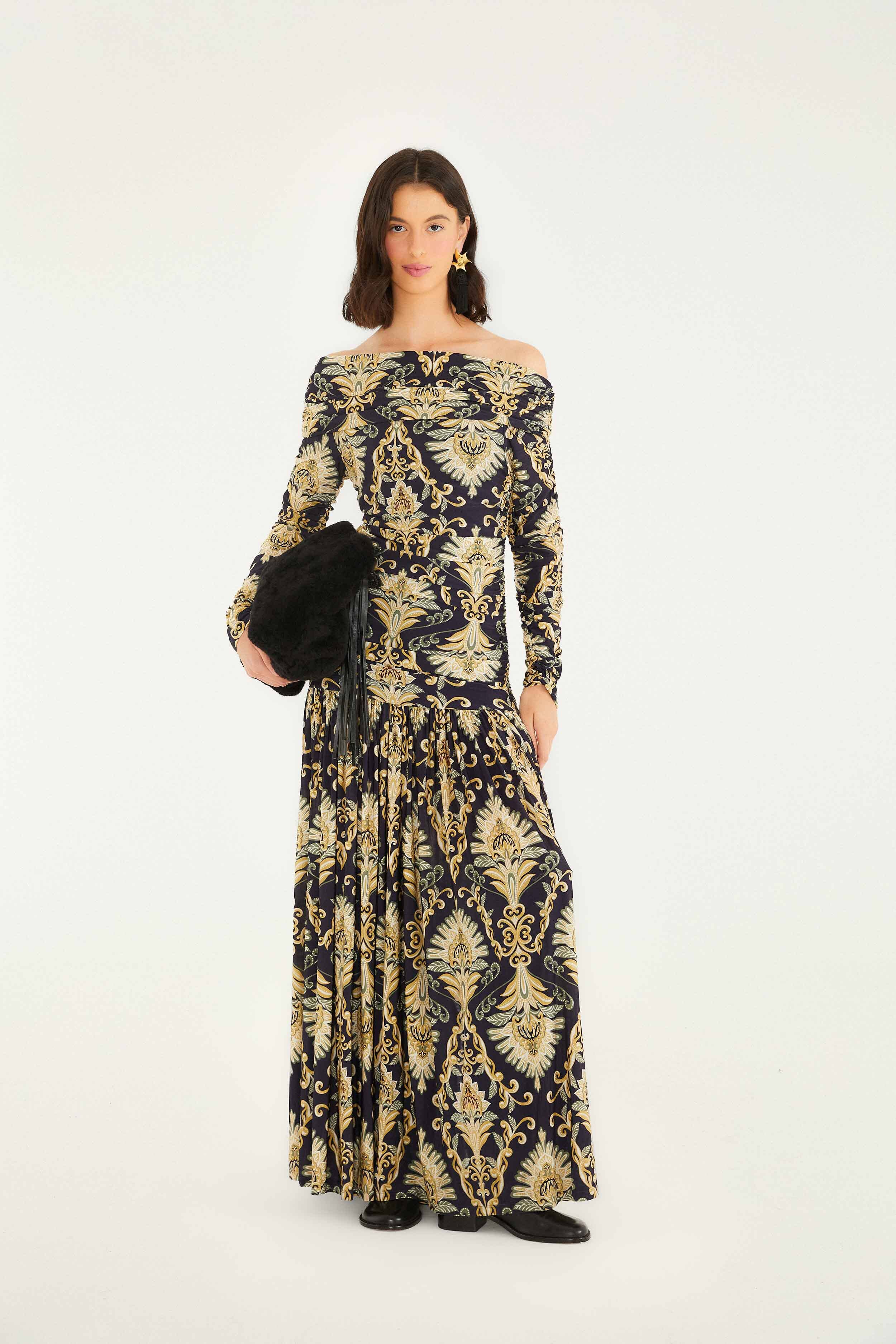 Navy blue off-shoulder maxi dress