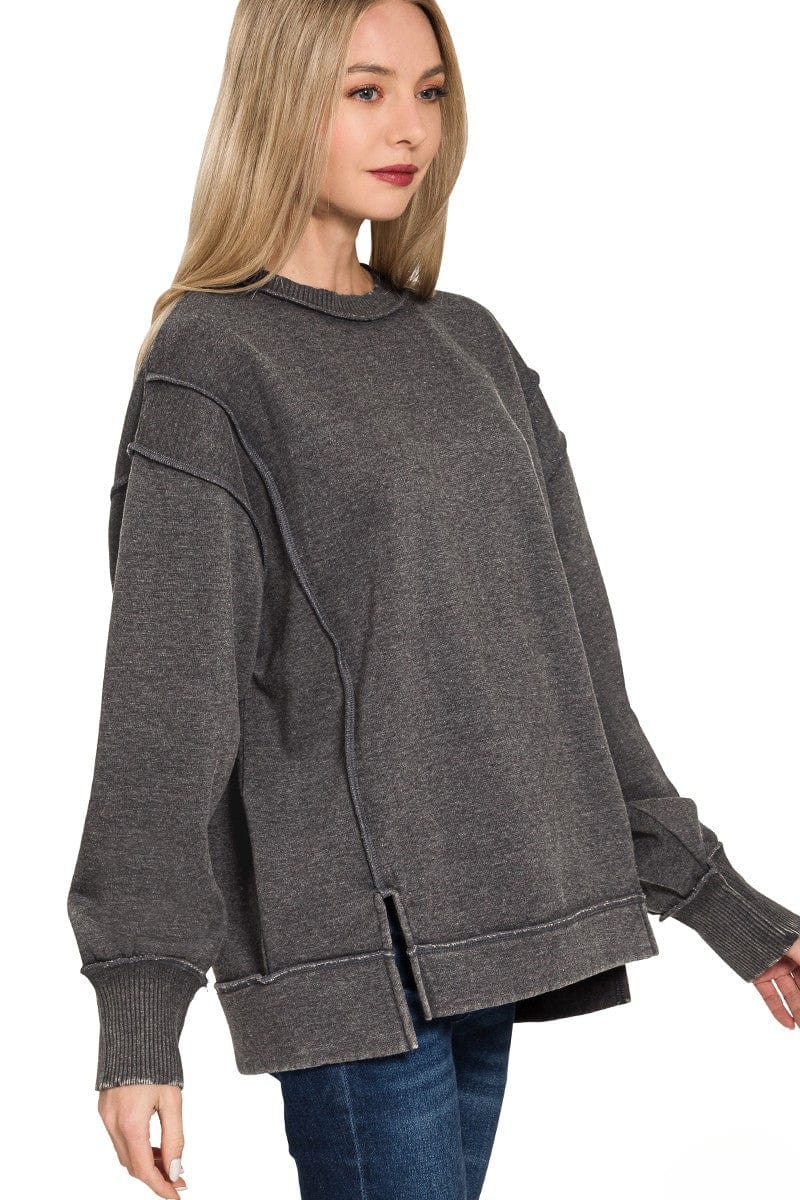 Zenana Acid Washed Exposed Seam Fleece Crew Neck Sweatshirt with Split Sleeves