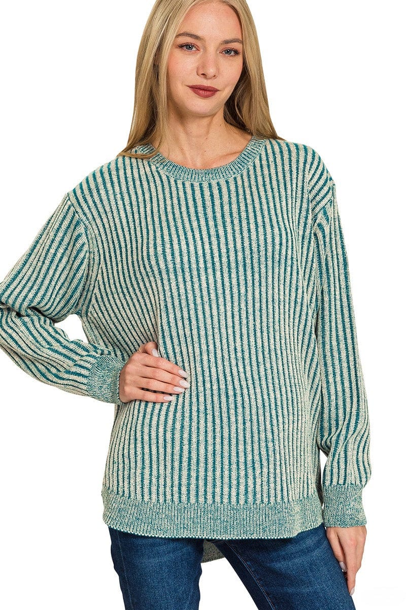 Zenana Curved Hem Two Tone Vertical Striped Sweater